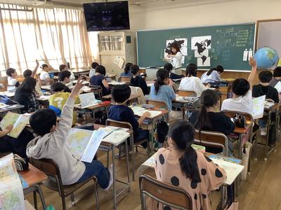 5年生の社会科の授業は、地図帳をしっかり使っていました。地図帳は、子どもたちの空間認識力や地理的な見方・考え方を育てるとともに、様々な学習や生活の場面に役立ちます。楽しみながら地図帳をどんどん活用していき、社会科の学びを深めてほしいです。