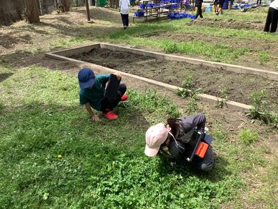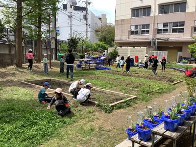 1年生の教室の隣りにある学級園では、4年生が理科の授業で春の生き物を探していました。「植物のいい臭いがする!」と言いながら探すのに夢中になっていました。
