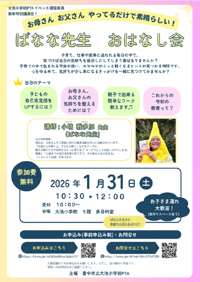 【大池小PTA】新年特別企画「ばなな先生 おはなし会」1月31日(土)多目的教室にて開催します!