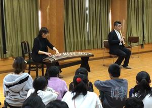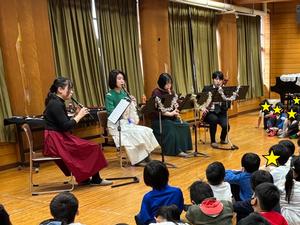 本校では12月2日に6年生、12月3日に3年生が大阪音楽大学(卒業生も含む)との連携による「サウンドスクール」が行われました。12月2日は6年生が「邦楽アンサンブル」を鑑賞し「琴」や「尺八」の音色を楽しみました。なんだかお正月を思い出させる音色でした。そして翌日の12月3日は3年生が「リコーダーアンサンブル」を鑑賞しました。自分たちが使っているリコーダーよりも長く大きなものやとても小さなリコーダーと様々な種類のリコーダーを見せていただき、聞き覚えのある曲や思わず口ずさんでしまう曲を披露してくださいました。