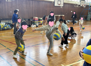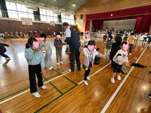 12月12日(金)、桜井谷地区福祉協議会のみなさんにお越しいただき、 1年生が体育館で昔あそびを体験しました。 会場には、こま・けん玉・あやとり・だるま落とし・まりつき・ ぼうずめくり・お手玉など、たくさんの昔あそびのブースが並びました。 子どもたちはグループの友だちと興味のある遊びを順番に めぐって挑戦していました。