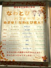 今年度のなわとびパフォーマンスの課題曲です。児童は、各学年ごとに示された初級、中級 上級の課題曲を自分で選んで技の習得をめざして授業や休み時間に挑戦しています。これから寒くなりますが、縄跳びを楽しみながら体力をつけてくれることを大いに期待しています。