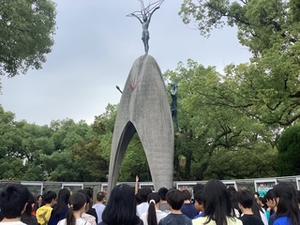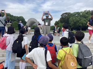 1日目は平和学習です。まず、厳粛な雰囲気の中で平和セレモニーが行われました。全校児童が平和への願いを込めて折った鶴を、6年生の決意の言葉とともに「原爆の子の像」に捧げました。その後、慰霊碑を一基ずつ説明を聞きながら巡り、平和記念資料館では多くの実物資料に触れることで、戦争の悲惨さや平和の尊さを改めて学ぶことができました。