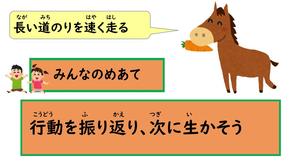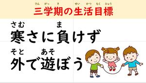 さて、始業式の今日、子どもたちのにぎやかな声が学校に戻ってきました。朝出会うと「あけましておめでとうございます」とあいさつをしてくれる素晴らしい子どもたち。地域の見守り活動をしてくださっている方からも、同様のお声をいただきました。始業式では、午年にあやかって馬のいいところから新田版学びの4本柱のめあてを確認しました。また、生活指導からは、3学期のめあて「寒さに負けず外で遊ぼう」について、「3つの『か』」で説明がありました。また、今日は豊中警察署からスクールサポーターの方に来ていただいて「ルールとマナー、いじめと万引き」についてお話をしていただきました。3学期は次の学年の0学期(ゼロ学期)。しっかりと基礎を固めて、次へステップアップ!