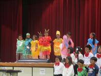 舞台上では演技役の子どもたちが赤おにや青おに、お菓子たち、村人たちになりきって、演技をすることができました。