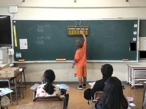 授業の中では、教室の前にある大きなそろばんを使って、計算の仕方を発表する場面もありました。「こうやって珠を動かすと答えが出るよ」と自分の考えを伝える子、それを真剣に聞く子、その後は友だち同士で問題を出し合う姿も見られ、学び合いが広がっていました。