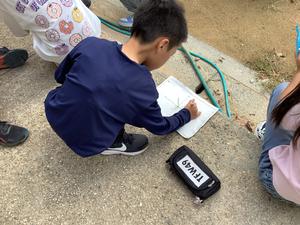 この日はあいにくの曇り空で、「観察できないまま終わってしまうのかな…」と心配する子の姿もありました。しかし、時間の最後になると、雲の切れ間から太陽が顔を出し、さんさんと輝き始めました。子どもたちは歓声を上げながら、かげの向きや長さをしっかりと記録することができ、無事に実験を終えることができました。