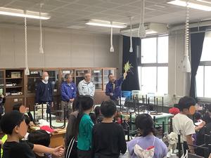 当日はまず理科室に集まり、田んぼでいつもお世話になっている地域の方々へ感謝のあいさつをしました。その後、鎌の正しい扱い方や注意点を丁寧に教えていただきました。初めての道具に少し緊張した面持ちの子どもたちでしたが、説明を真剣に聞き、いざ田んぼへと移動しました。