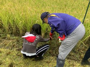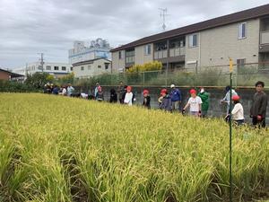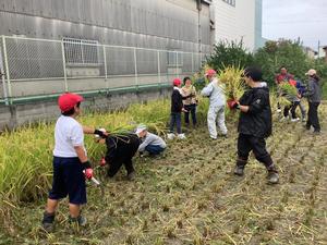 5年生が田んぼプロジェクトの一環として「稲かり」を行いました。6月に植えた稲は、地域の方々のお力添えをいただきながら、すくすくと育ち、いよいよ収穫の時を迎えました。