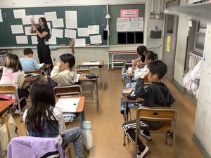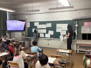 授業では、先生が分からない言葉をすぐにテレビに画像で映してイメージを深めたり、板書を整理するときに「手伝ってくれる人?」と呼びかけて子どもたちが進んで協力したりと、意欲的に学習に取り組めるようたくさん工夫されていました。