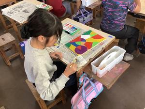 授業を見に行くと、子どもたちは板に分度器や三角定規、円などの図形を組み合わせて模様を描いていました。算数で学んだ知識を生かしながら、デザインに工夫を凝らす姿が印象的でした。絵の具で色を重ね、華やかな模様が少しずつ完成していく様子からは、一人ひとりの個性が輝いていました。