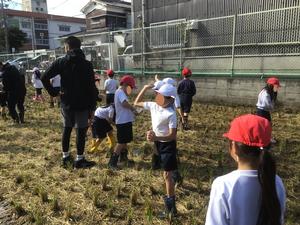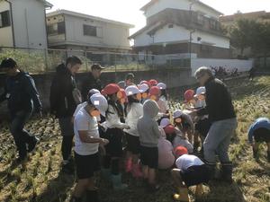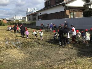 5年生が稲かりを終えた田んぼで、1・2年生がレンゲの種まきを行いました。種まきは、田んぼプロジェクトの方々が事前に土と種を混ぜて準備してくださったものを使い、「節分の豆まき」のように手でまいていきました。