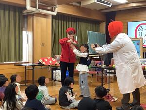 楽しいお話には、「1本の木に約400個のりんごがなり、すべてに紙袋をつけていく。それを100本つけていくと…」といったりんご農家の苦労話もあり、子どもたちは「へぇ~!」「そんなことしてるんだ!」と驚きの声をあげながら、ぐんぐん興味を高めていました。