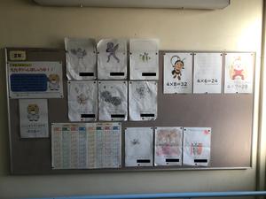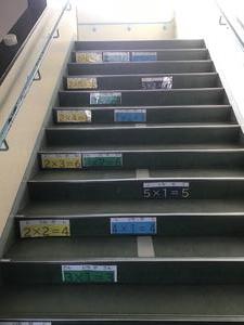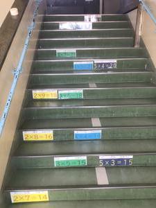 1~2階へ上る階段には、教職員が手作りした「九九カード」が貼られています。答えが同じになる九九を横に並べて掲示しており、「同じ答えでも式が違うんだ!」「つながっている!」と、子どもたちが気づきを広げられるよう工夫しています。階段を上りながら、思わず立ち止まって確かめる子の姿も見られ、学びが生活の中に自然と溶け込んでいます。