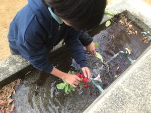 10月に植えた小松菜とラディッシュがすくすくと育ち、いよいよ収穫の時を迎えました。5年生の子どもたちは、自分たちで手入れをしてきたプランターから一つひとつ丁寧に収穫しました。色鮮やかな小松菜の緑や、かわいらしいラディッシュの赤を手に取り、「きれい!」「大きくなってる!」と、どの子も目を輝かせていました。