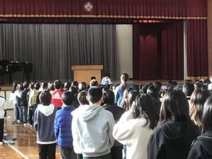続いて、代表委員の児童から、1月の生活目標として「生活リズムを整えよう」「遅刻をしない」という、季節に合わせた目標が発表されました。病気が広がりやすく、朝起きるのが億劫になる時期です。一人ひとりがしっかりと目標に向けて頑張ってほしいと思います。
