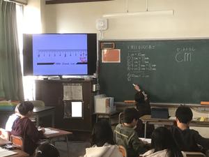 また、「cm」と「mm」の関係を考えながら、単位の変換にもチャレンジし、数の見方を少しずつ広げています。先生がTVに映したものさしの目盛りを見てイメージしながら学習を進めていました。