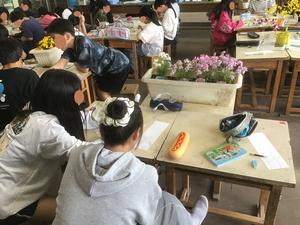 教室には、グループごとにきれいな春の花が置かれ、子どもたちは花びらの形や色の違い、茎や葉の細かな様子までよく見ながら、ていねいに描き表していました。一人ひとりが春のやわらかさや美しさを感じ取り、それぞれの作品に表している様子がとても印象的でした。