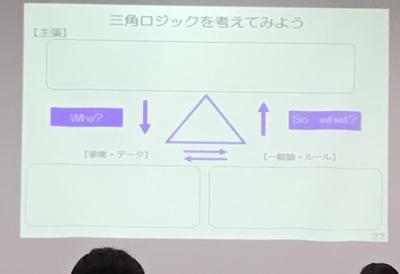 最後に、論理的に伝える方法として論理の3大要素である三角ロジックを教わり、塾生一人ひとりが、自身の主張をロジカルに相手に表現する事に挑戦しました。