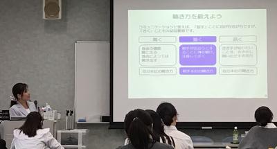 この後、「聴く力」…相手の話を遮らず、関心をもって聞く体験を目的としたペアワーク「3分インタビュー」を行いました。