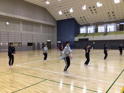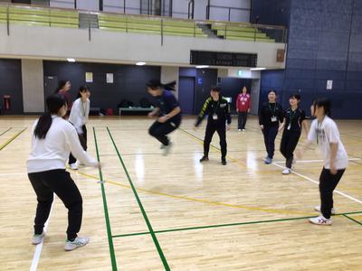 最後に中なわをしました。8の字跳びだけでなく、いろいろなバリエーションを紹介していただきました。さらに、2本の中なわを十字にして同時に回したり、最後にはダブルダッチをしたりもしました。初めて体験する受講生も多かったようですが、上手に跳べる受講生が続出しました。それも積極的なコミュニケーションが大きく、成功した時の拍手や盛り上がりもすごかったです。できなかったことができるようになる喜びや達成感は、大人になっても感じられることを改めて実感できたのではないでしょうか。もちろん、それは子どもも同じです。一人でも多くの子どもやクラスが喜びや達成感を感じられるよう、今回の講座を基にどんな手立てが必要か、今後考えていって欲しいです。