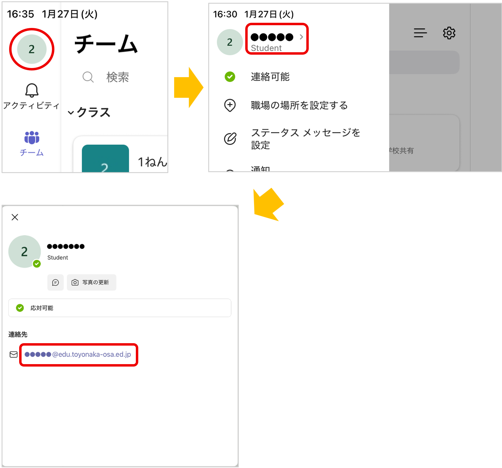 各アプリの左上のアイコンをクリックして表示されるメールアドレスが、学校から配布された『児童生徒用アカウント情報』のアドレスになっているか、ご確認ください。